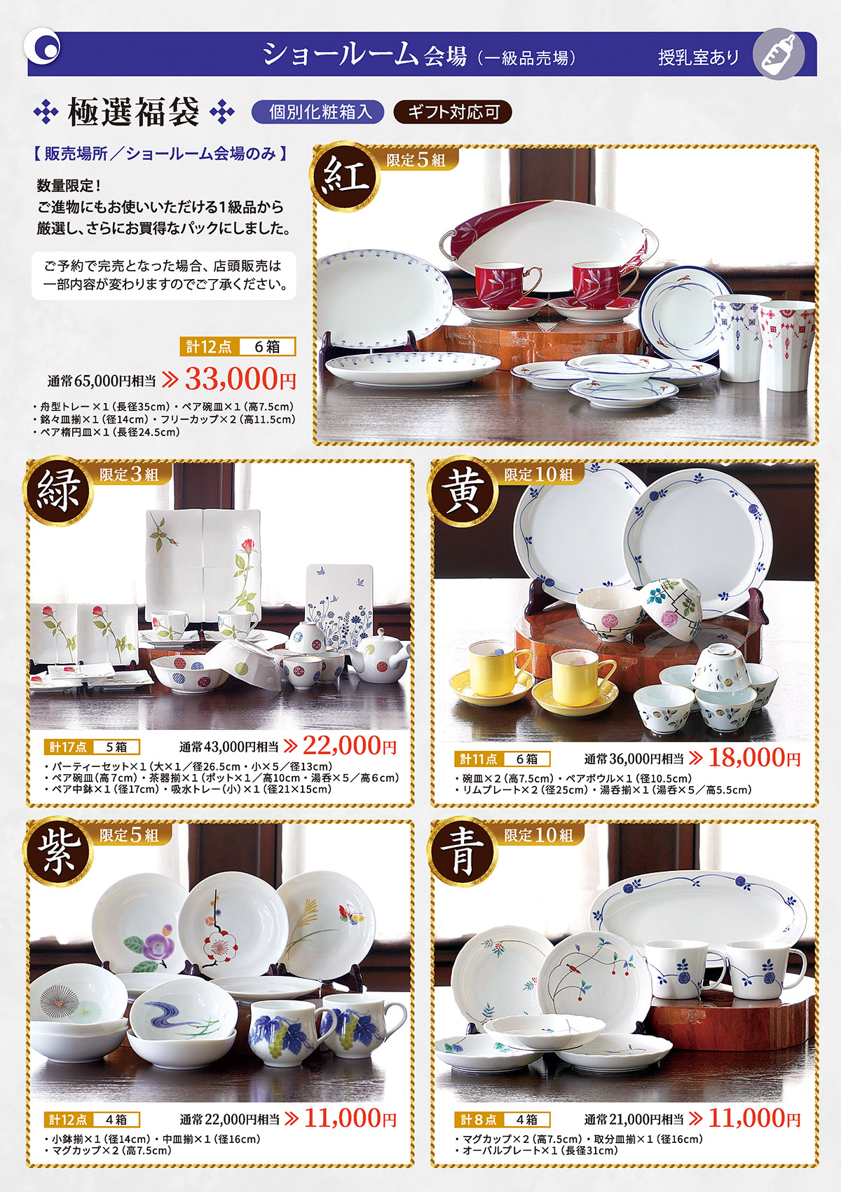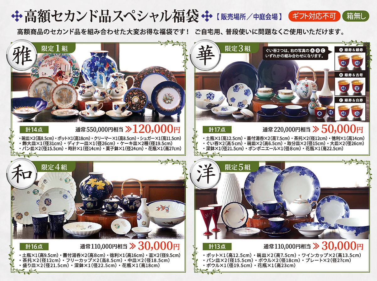 豪華『極選福袋』、大人気『エコバッグ付福袋』は、ショールーム会場での販売です。