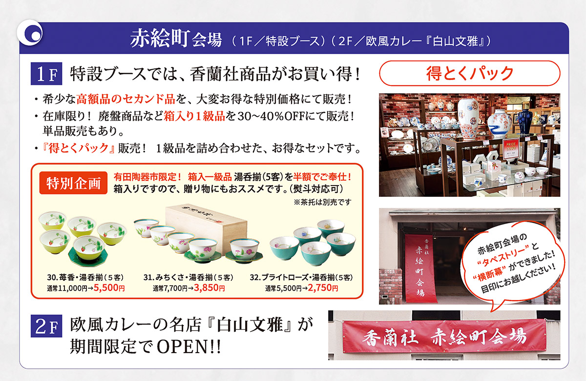 1階:香蘭社商品の在庫限り箱入り1級品や「得とくパック」、高額セカンド品を販売します。
