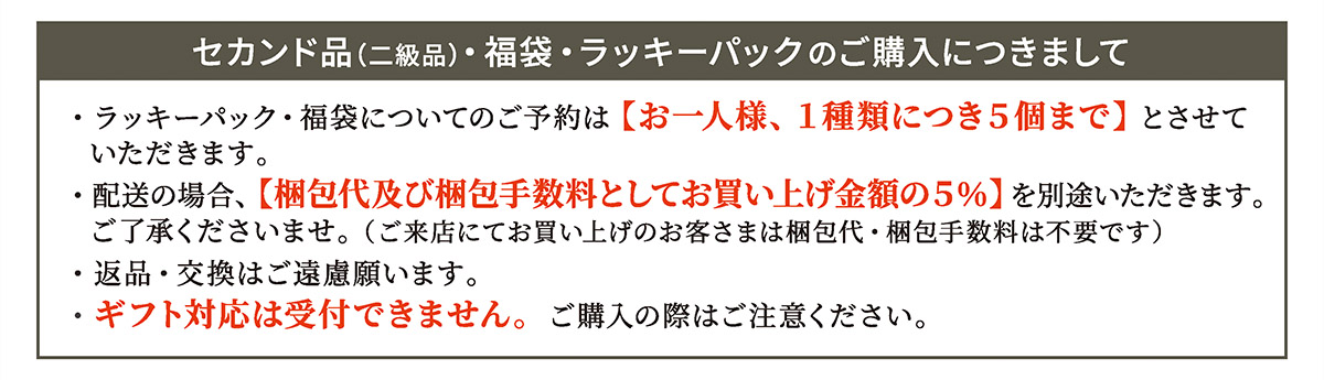 ※掲載の各種福袋がご予約で完売となった場合、店頭販売は一部内容が変わりますのでご了承ください。